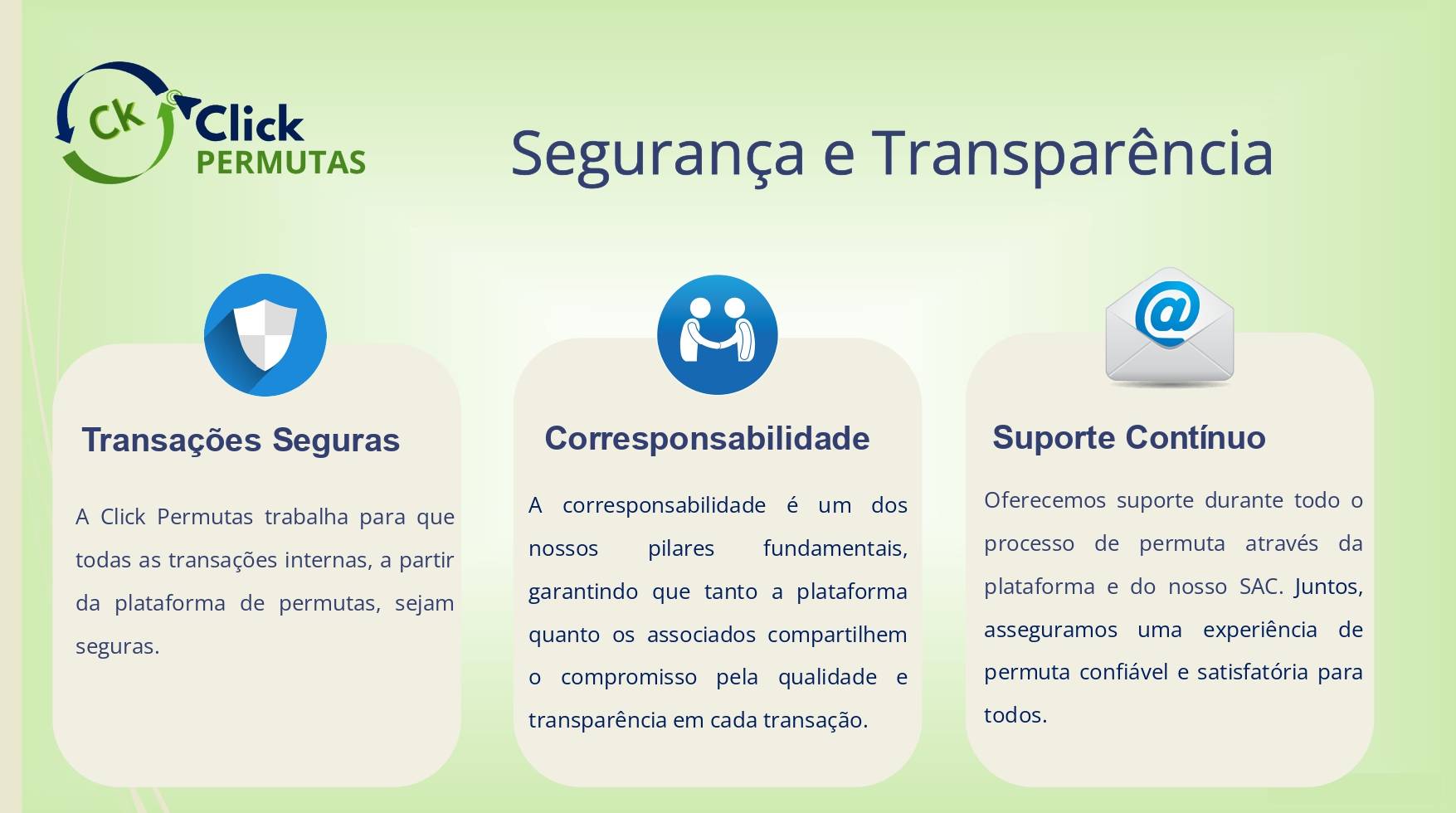 Sim, a plataforma Click Permutas garante segurança e praticidade nas transações, através de uma rede de afiliados confiáveis e um sistema de permutas bem estruturado. A Click Permutas é o espaço ideal para profissionais liberais e para pequenas, médias e grandes empresas otimizarem seus recursos, criarem novas parcerias e expandirem seu network.
